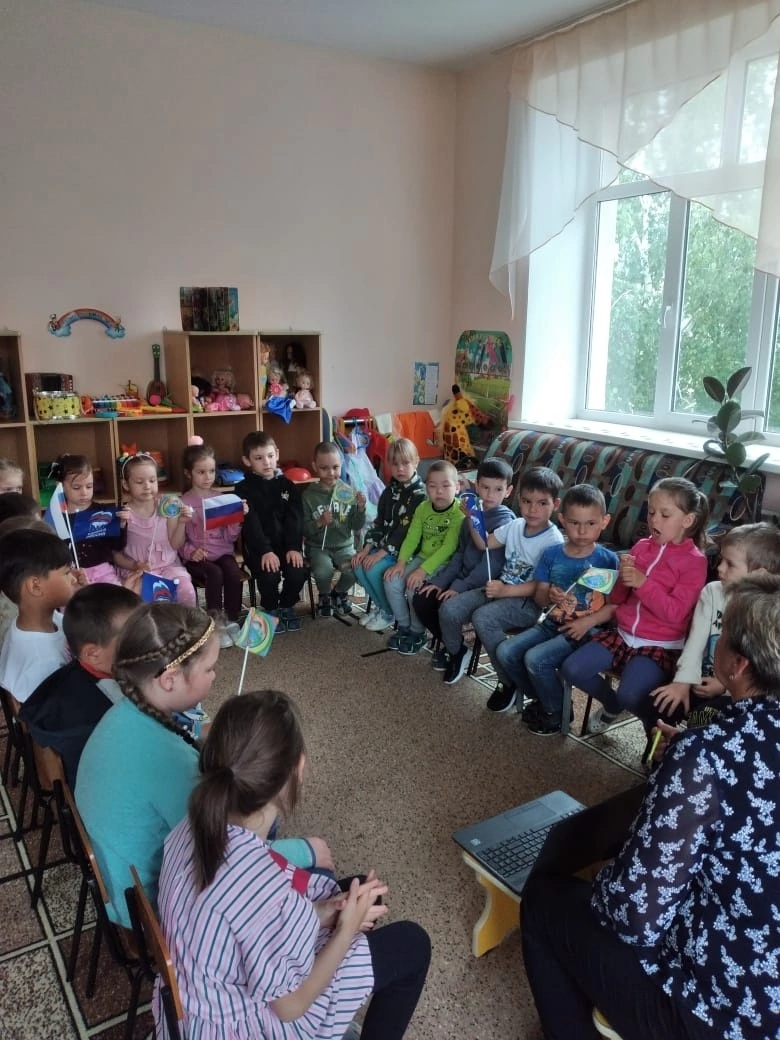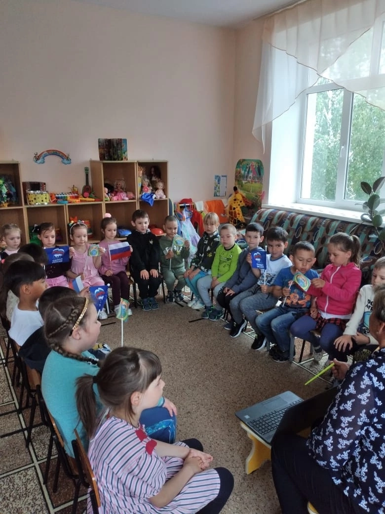 Накануне Дня России в старшей группе "Колокольчик" МАДОУ детский сад "Родничок" прошла беседа, посвященная этому празднику. Целью мероприятия было развитие у детей любви к Родине, интереса к ее истории и традициям, воспитание уважительного отношения к символам страны. Воспитатель Валентина Николаевна рассказала , что этот праздник стали отмечать в 1994 году, когда президент РФ Б.Н. Ельцин издал указ о праздновании "Дня России".