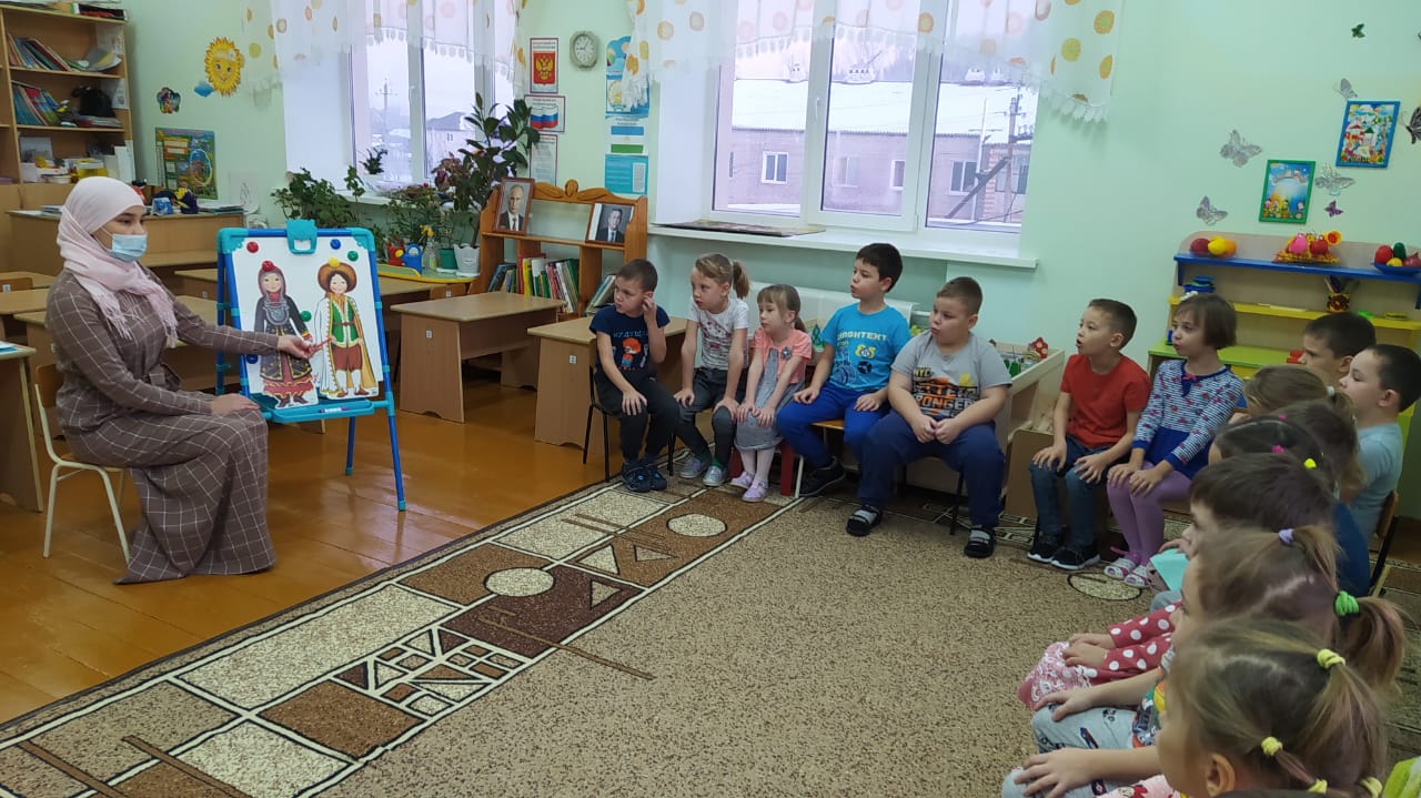 Учитель башкирского языка Ишкильдина Н.Ш. на своем занятии рассказала детям о национальности «башкир», читала стихи башкирских поэтов. Перевоплотившись в бабушку, она рассказала сказку: "Как бабушка превратилась в птицу". Затем на башкирском языке провела с детьми пальчиковую игру «Бармаҡтар ғәиләһе» - «Семья пальчиков», разучила колыбельную песню – «Бишек йыры».